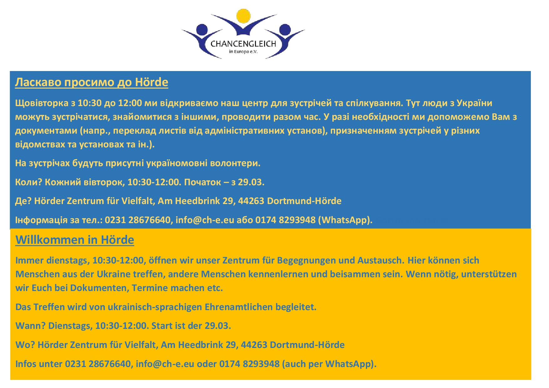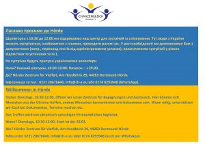 Ab dem kommenden Dienstag, 29.03., öffnet der Verein „Chancengleich in Europa“ zunächst 1x die Woche immer dienstags von 10:30 bis 12:00 das „Zentrum für Austausch und Begegnungen“, Am Heedbrink 29.